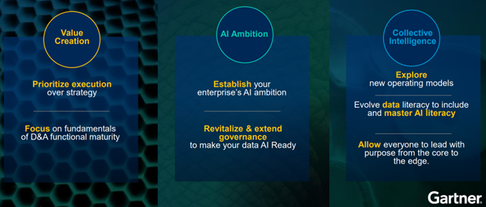 가트너(Gartner)가 데이터 및 분석 리더는 ‘가치 창출’, ‘AI 야망(AI Ambition)’, ‘집단 지성’이라는 세 가지 요소를 통해 의사 결정 행동을 촉진하고, 집단 지성을 효과적으로 발휘하는 역량을 갖춰야 한다고 밝혔다. 새로운 집단 지성의 시대의 가치 창출은 이러한 세 가지 핵심 영역에 대한 집중이 필수 요소라는 것이다.