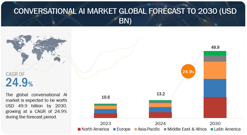 대화형 AI 시장 규모가 2024년 132억 달러에서 2030년 499억 달러로 증가하며, 24.9%(CAGR)의 성장률을 기록하며 성장세를 이어갈 전망이다. 생성형 AI의 출현으로 촉발된 대화형 AI의 확산과 성장이 다양한 서비스에서의 챗봇 도입을 촉진하고, 컴퓨터 비전과 음성 인식 기술의 통합 증가가 성장을 이끄는 요인이다.