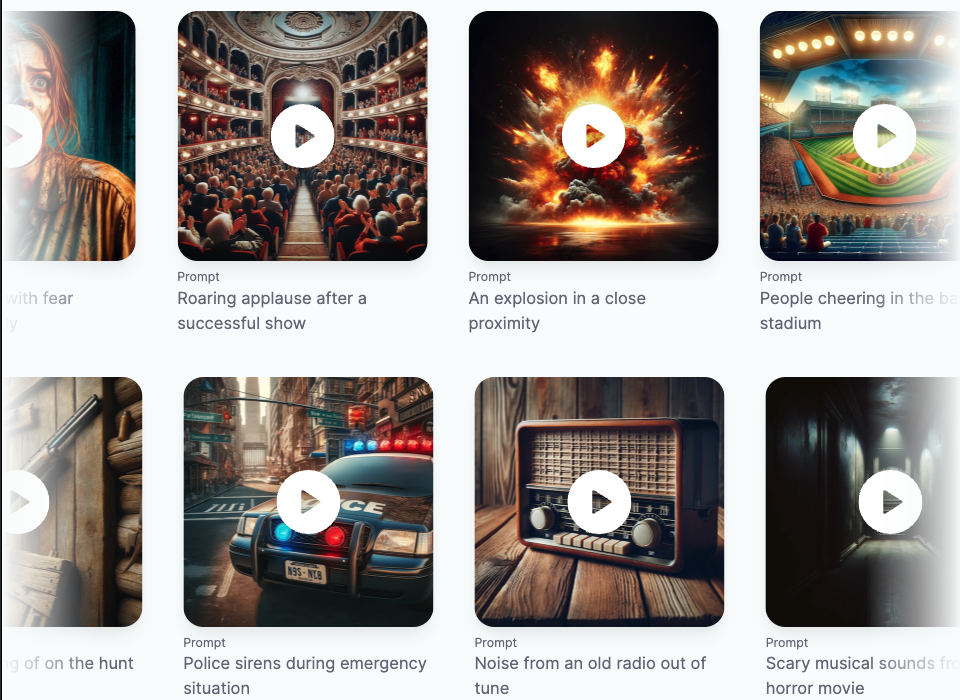 예를 들면 ‘성공적인 공연이 끝난 후 환호하는 관객’, ‘울타리 뒤에서 짖는 강아지’, ‘사무실에 키보드를 두드리는 소리’, ‘옛 소련 도시에서 울리는 사이렌’ 소리 등을 문자로 입력해서 생성할 수 있다. 챗GPT처럼 프롬프트에 만들고 싶은 소리 유형을 설명하면, 4가지 종류의 비슷하면서도 서로 다른 소리를 만들어 준다.
