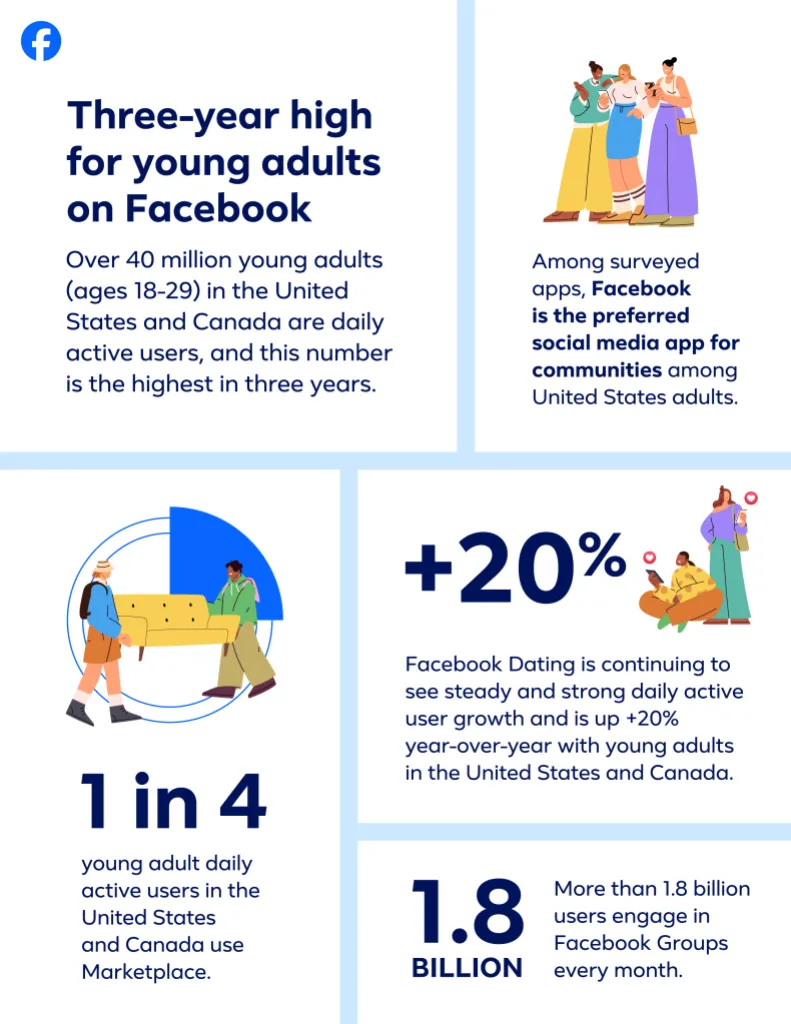 “페이스북(Facebook)은 앞으로의 성공을 위해 젊은 세대(young adults)를 위한 차세대 소셜 미디어 구축과 AI를 활용한 새로운 제품 기능의 활용이라는 두 가지 큰 과제에 집중하고 있다. 4천만 명 이상의 미국과 캐나다 청년이 매일 페이스북을 활발히 이용하고 있으며, 이는 3년 만에 가장 높은 수치이다.”