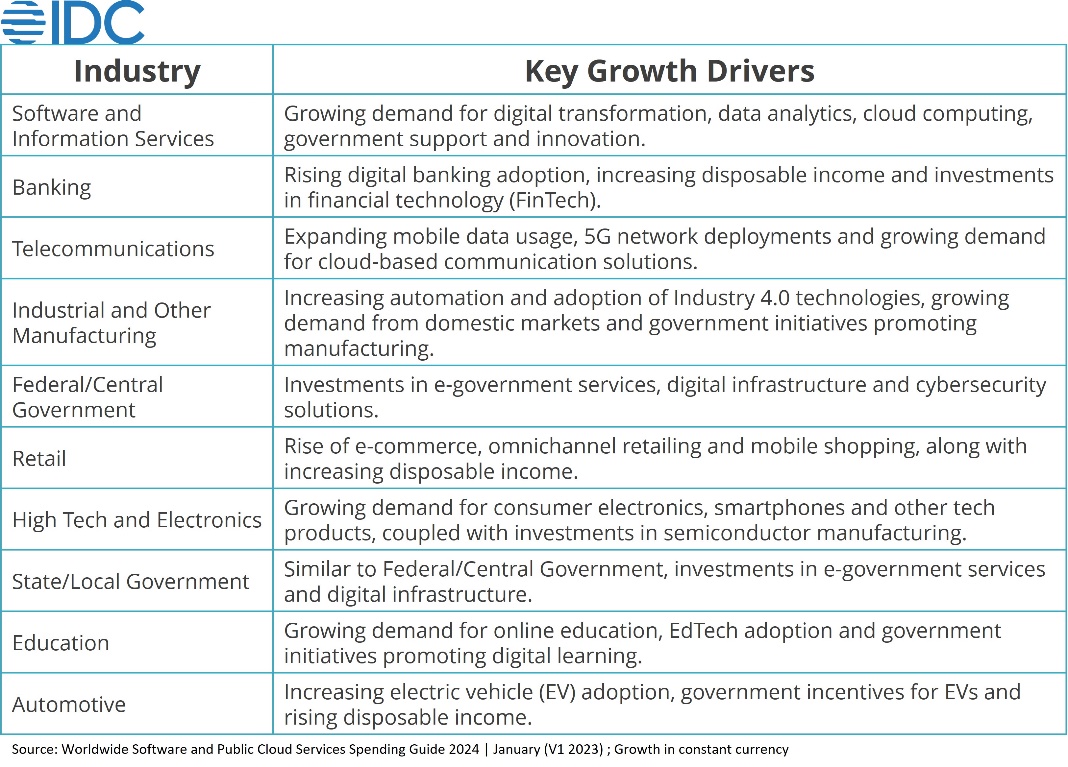 클라우드 및 소프트웨어 시장의 60% 이상을 차지하는 상위 10개 산업을 이끄는 주요 성장 동력으로는 소프트웨어 및 정보 서비스, 은행, 통신, 산업 및 제조, 연방 및 중앙 정부, 소매, 하이테크 및 전자, 주 및 지방 정부, 교육, 자동차를 꼽았다.