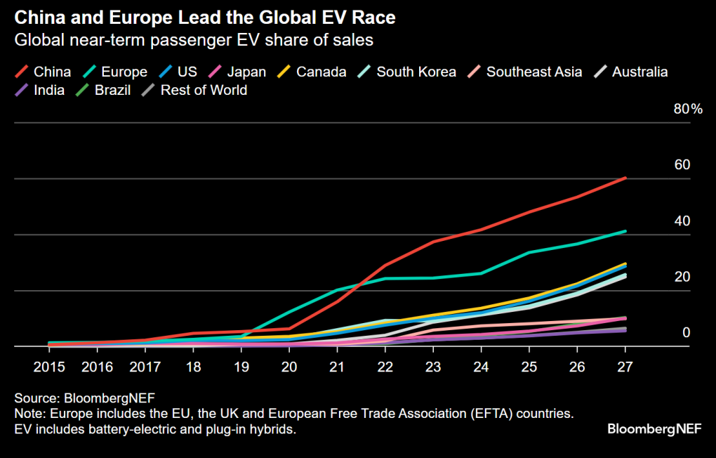 글로벌 전기차 시장은 미국 시장을 모방해 함께 둔화하고 있는 것으로 나타났다. 전 세계 전기차 판매량은 2020년부터 2023년까지 평균 60% 이상 성장했지만 2027년까지는 매년 21% 씩 증가할 것으로 예상했다. 미국 시장의 경우는 2027년까지 각각 60%와 41%로 예상되는 중국과 유럽의 성장세를 뒤쫓을 전망이다.