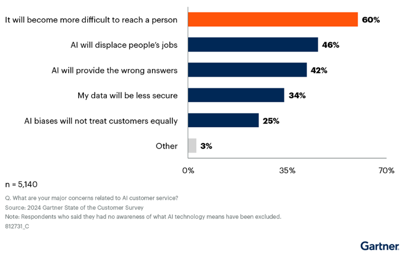 46%는 AI가 일자리를 대체할 것이라는 우려 때문에, 42%는 AI가 잘못된 답변을 제공할 것이라고 생각해서 우려를 표명했다. 자신의 개인 정보가 안전하지 않을 것이라고 생각하는 경우가 34%, AI가 편견을 가지고 있어 고객을 동등하게 대하지 않을 것이라는 생각이 25%를 차지했다.