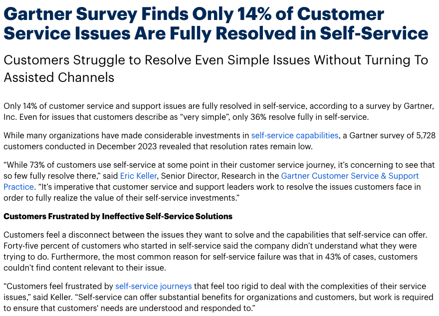 가트너의 고객 서비스 및 지원 관행 연구 부문의 에릭 켈러(Eric Keller) 수석 이사는 “고객이 해결하고자 하는 문제와 셀프서비스가 제공할 수 있는 기능 사이에 괴리가 있다. 셀프서비스를 시작한 고객의 45%는 회사가 자신이 무엇을 하려고 하는지 이해하지 못했다고 답했다. 또한 셀프서비스 실패의 가장 일반적인 이유는 43%의 고객이 자신의 문제와 관련된 콘텐츠를 찾지 못했기 때문이었다”고 전했다.