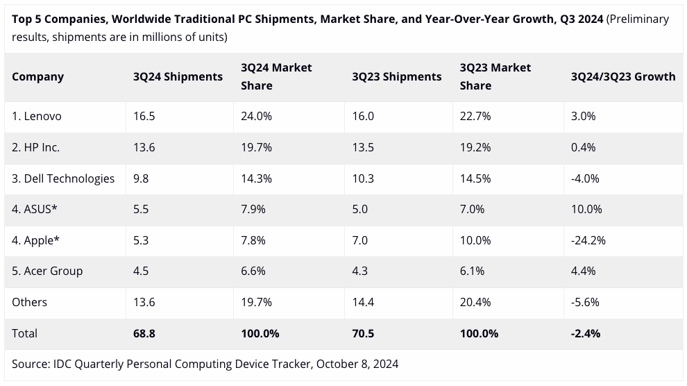 상위 5개 업체 가운데 출하량이 줄어든 곳은 3위 델 테크놀로지(Dell Technologies)와 에이수스와 공동 4위인 애플이다. 2023년 3분기에 1,030만 대를 출하했던 델은 2024년 3분기 출하량이 980만 대로 줄어들면서 -4%의 연간 성장률을 기록했다. 시장 점유율도 14.5%(3Q 2023)에서 14.3%(3Q 2024)로 떨어졌다.