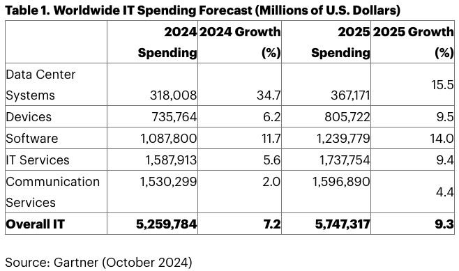데이터 센터 시스템 다음으로 성장률이 높은 소프트웨어 부문은 2024년에 11.7% 성장하며 지출 규모가 1조 878억 달러에 이를 전망이다. 2025년에는 14%의 성장률을 기록하며 지출 규모가 약 1조 2,398억 달러에 이를 것으로 예상했다. 지출 규모가 가장 큰 IT 서비스는 2024년과 2025년 각각 5.6%와 9.4%의 성장률을 기록하며, 지출 규모가 1조 5,880억 달러에서 1조 7,380억 달러로 증가할 것으로 예측했다.