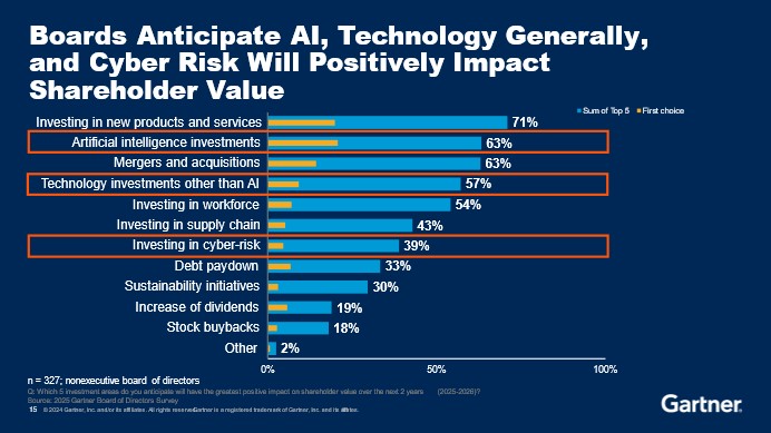아울러 향후 2년간 주주 가치를 높일 수 있는 상위 5가지 투자 분야를 묻는 질문에 71%의 응답자가 선택한 1위 새로운 제품과 서비스를 꼽았다. 2위는 63%가 선택한 AI였고, 57%가 선택한 AI가 아닌 기술에 대한 투자는 4위에 올랐다. 7위에 오른 사이버 위험에 대한 투자를 선택한 응답자는 39%였다.