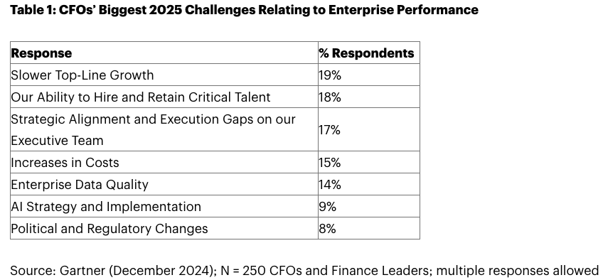 CFO들이 복수 응답을 통해 선정한 2025년의 주요 과제는 ▶︎매출 성장 둔화(19%) ▶︎핵심 인재의 채용 및 유지 능력(18%) ▶︎경영진의 전략적 정렬 및 실행 격차(17%) ▶︎비용 증가(15%) ▶︎기업 데이터 품질(14%) ▶︎AI 전략 및 실행(9%) ▶︎정치적 및 규제적 변화(8%)였다.