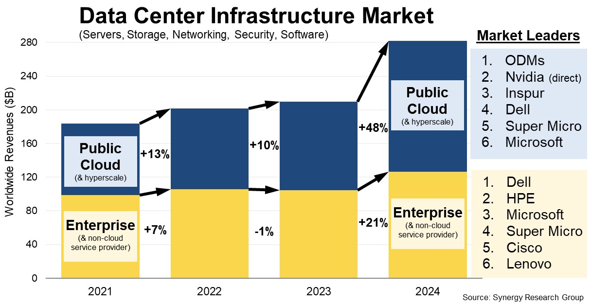 시너리 리서치 그룹은 클라우드 및 비클라우드 하드웨어와 소프트웨어를 모두 포함한 총 데이터센터 인프라 장비 매출 규모가 2024년에 2,820억 달러에 달하고, 퍼블릭 클라우드 인프라가 전체 매출 규모 중에서 1,560억 달러를 차지할 것으로 예상했다.