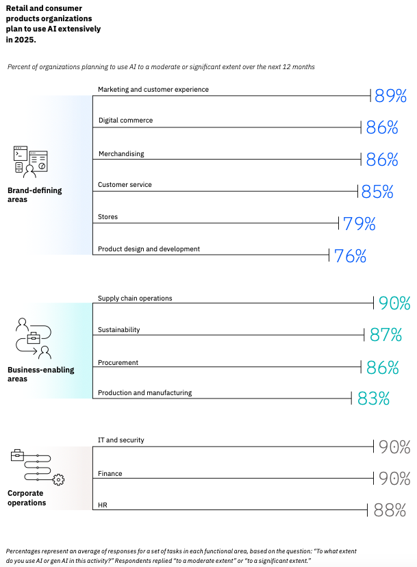 2025년 소매 및 소비자 기업은 평균적으로 매출의 3.32%를 AI에 투자하며, 고객 서비스, 공급망 운영, 인재 영입, 마케팅 혁신 등에서 AI를 통해 기존 애플리케이션을 확장할 것으로 예상된다. 이에 따라 소매 및 소비자 기업은 AI 지출이 IT 예산을 넘어 52% 급증할 전망이다.