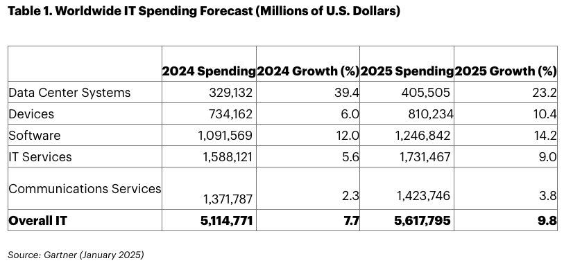 가트너(Gartner)가 ‘2025년 전 세계 IT 지출 전망’을 발표했다. 2025년에는 2024년 보다 9.8% 증가한 5조 6,100억 달러가 IT 에산으로 지출될 전망이다. 데이터 센터 시스템, 장치(device), 소프트웨어 분야는 두 자릿수 성장이 예상되며, 생성형 AI에 대한 수요 증가로 인한 하드웨어 업그레이드가 성장을 견인할 것으로 예상했다.