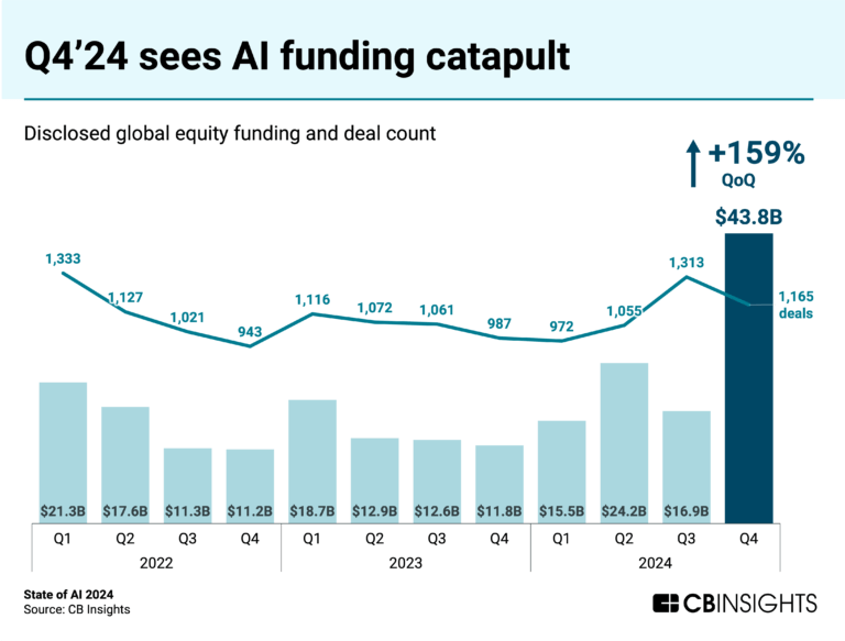2024년 전 세계 AI 관련 스타트업이 유치한 투자 자금 규모가 1,004억 달러를 넘어선 것으로 조사됐다. 2024년 4분기에만 직전 분기보다 159% 증가한 438억 달러에 달했다. 1억 달러 이상의 대규모 거래(Mega-round)가 2024년 4분기 자금의 80%를 차지했고, 2024년 전체로 보면 69%를 기록한 것으로 나타났다.
