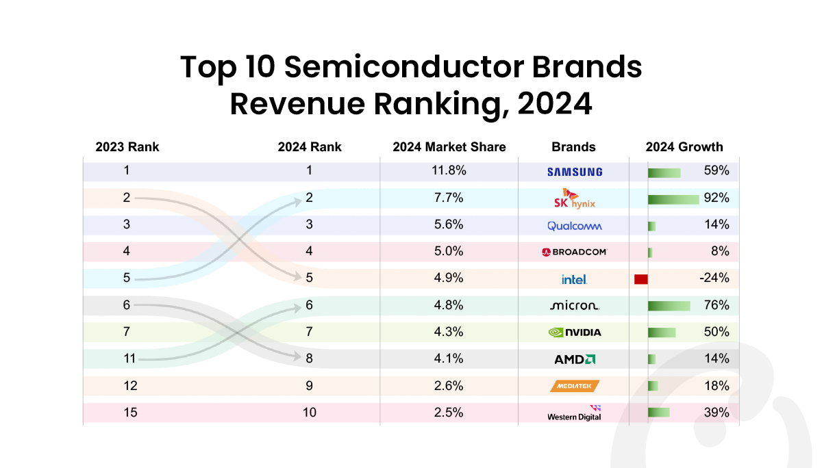 2024년 글로벌 반도체 시장에서 매출 1위는 11.8%의 시장 점유율을 기록한 삼성으로, 2023년에 8.9%를 기록했던 시장 점유율이 2024에는 이 보다 2.9% 상승했다. 스마트폰 시장에 대한 전략적 재고를 사전에 구축한 것이 성장 배경이라는 것이 카운터포인트의 분석이다.