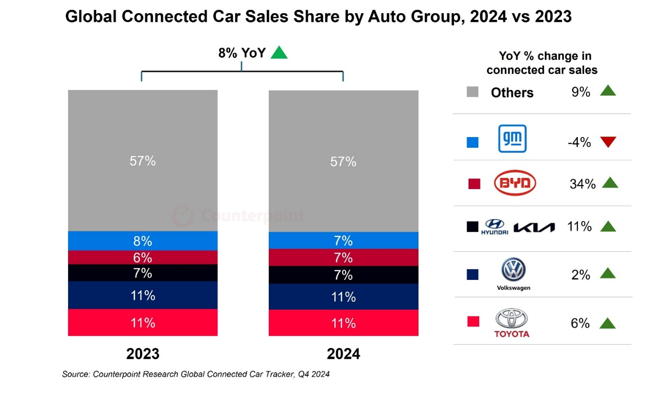 카운터포인트(Counterpoint)가 ‘2024년 4분기 글로벌 커넥티드 카 트래커(Global Connected Car Tracker, Q4 2024)’를 발표했다. 전 세계에서 2024년 판매된 커넥티트 카 판매량은 2023년 보다 8% 증가하며, 네트워크 연결 기능읕 탑재한 커넥티트 카 시장이 확대되고 있다.