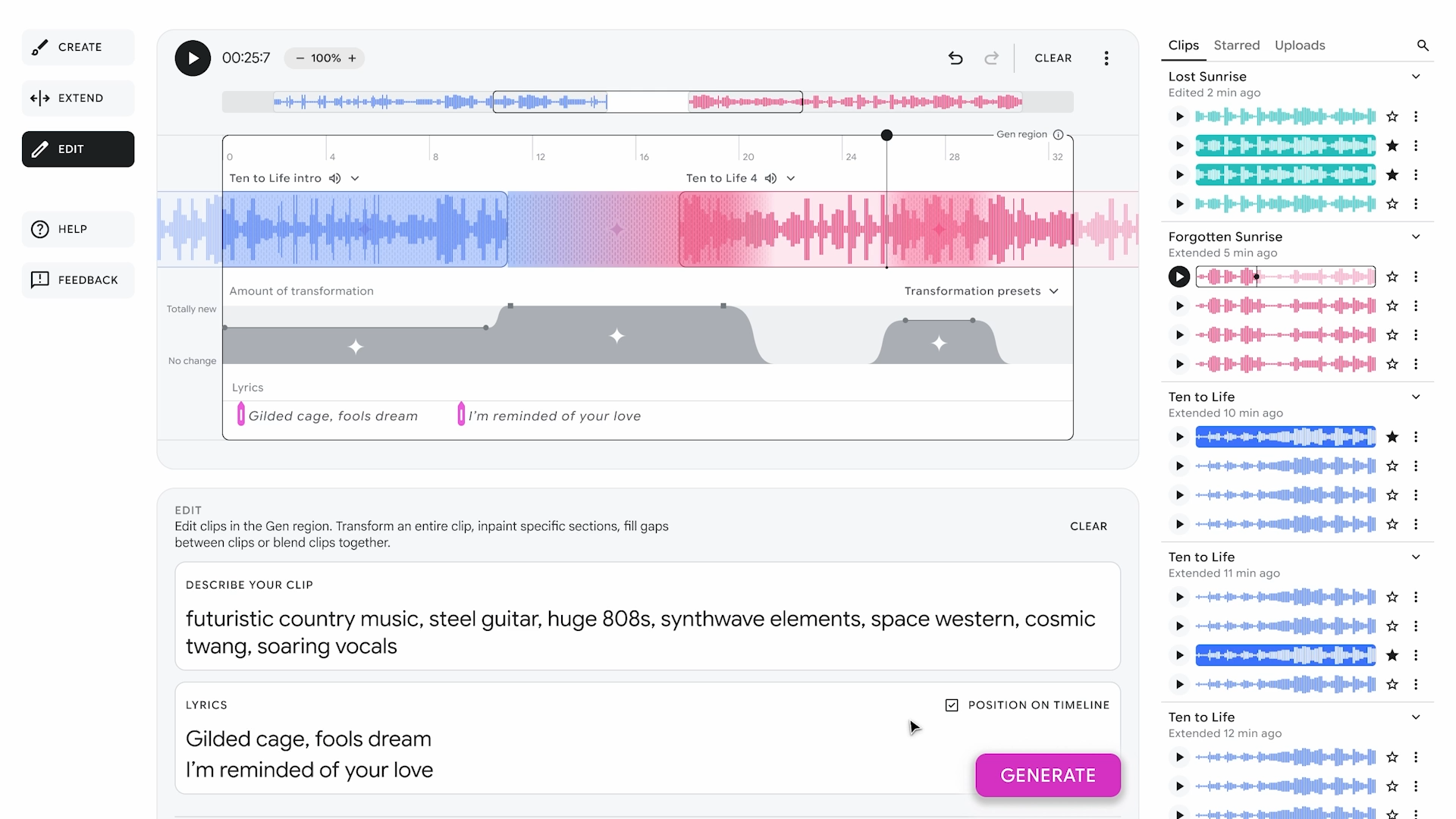 편집은 작업했던 모든 부분에 대해 분위기, 장르, 스타일, 위치 등 전체 또는 부분을 마음대로 수정할 수 있는 기능이다. 텍스트 프롬프트, 오디오 파형과 위치, 가사 위치와 순서 등을 자유롭게 이동, 혼합, 변형하면서 도구를 활용한 음악 창작 작업을 이어갈 수 있다.