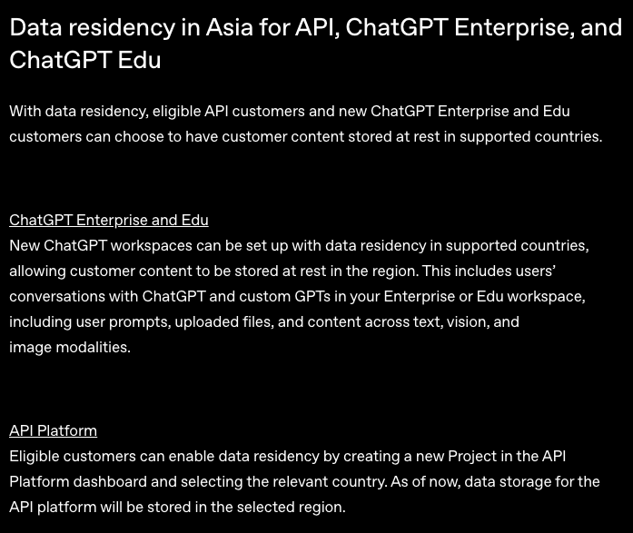 다만, 애플 인텔리전스와 타사 GPT는 데이터 레지던스 지원에서 제외된다. 또한 데이터 레지던스가 활성화된 작업 공간에 대해서는 GPT 공유 설정을 ‘모든 사용자’로 설정할 수 없다. 챗GPT 엔터프라이즈 및 챗GPT 에듀는 추가 비용없이 데이터 레지던시 기능을 사용할 수 있다. API 플랫폼은 지역별로 지원 모델, 요금 등에 차이가 있을 수 있다.