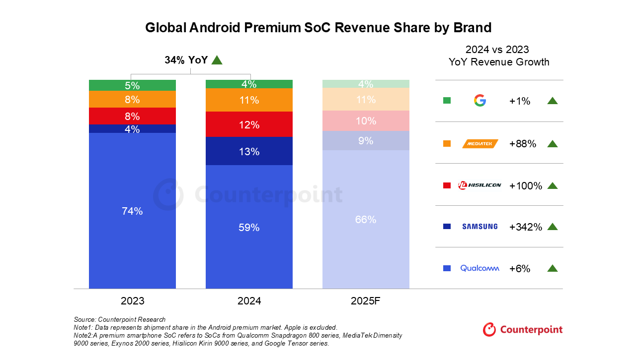 전 세계 프리미엄 안드로이드 SoC 매출 1위는 퀄컴으로 2024년 전체 매출의 59%를 퀄컴이 달성했다. 이는 2023년 74%에서 15% 하락한 것이지만 2025년에는 66%로 증가할 것으로 카운터포인트는 예상했다. 퀄컴의 연간 매출 증가율은 6%로 집계됐다.