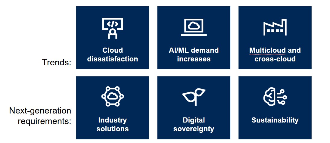 가트너가 2025년부터 4년간 클라우드의 미래를 형성할 6가지 주요 트렌트를 발표했다. 클라우드 불만족(Cloud Dissatisfaction), AI/ML 수요 증가(AI/ML Demand Increases), 멀티클라우드 및 크로스 클라우드(Multicloud and Cross Cloud), 산업 솔루션(Industry Solutions), 디지털 주권(Digital Sovereignty), 지속 가능성(Sustainability )이 그것이다.
