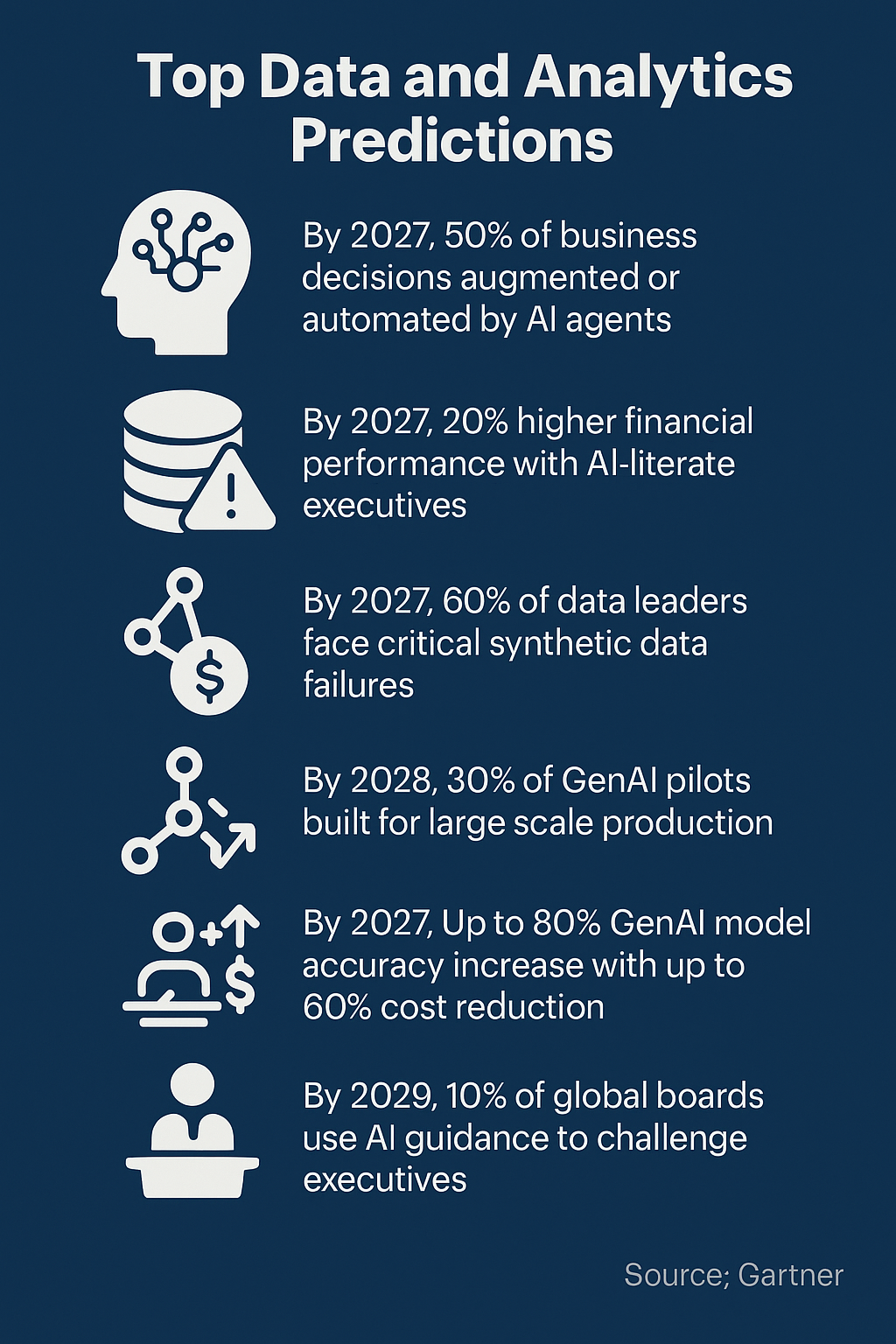 가트너(Gartner)가 2025년 이후 주요 D&A(Data & Analytics) 예측을 발표했다.이번 발표에 따르면 비즈니스 의사 결정에서 AI 에이전트에 의한 증강 또는 자동화, 경영진의 AI 활용 능력이 재무 성과 향상, 합성 데이터 관리의 중대한 실패는 AI 거버넌스 등을 위협할 전망이다. 주요 내용 6가지는 다음과 같다.
