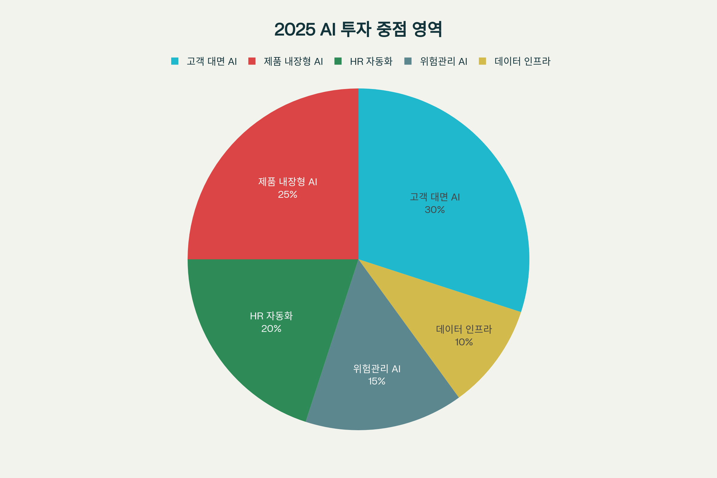 "AI 경쟁에서 이기기 위한 올바른 비용 구조 전환의 시기가 바로 지금"이라는 밴트의 말처럼, 기업들은 AI를 더 이상 실험적 투자가 아닌 필수적 방어 수단으로 바라보고 있다. 2024년이 AI에 대한 광범위한 실험의 해였다면, 2025년은 선별적 배치와 통합의 해가 되고 있다. 구체적으로 보호받고 있는 AI 투자 영역을 살펴보면 고객 대면 AI가 가장 큰 비중을 차지한다.