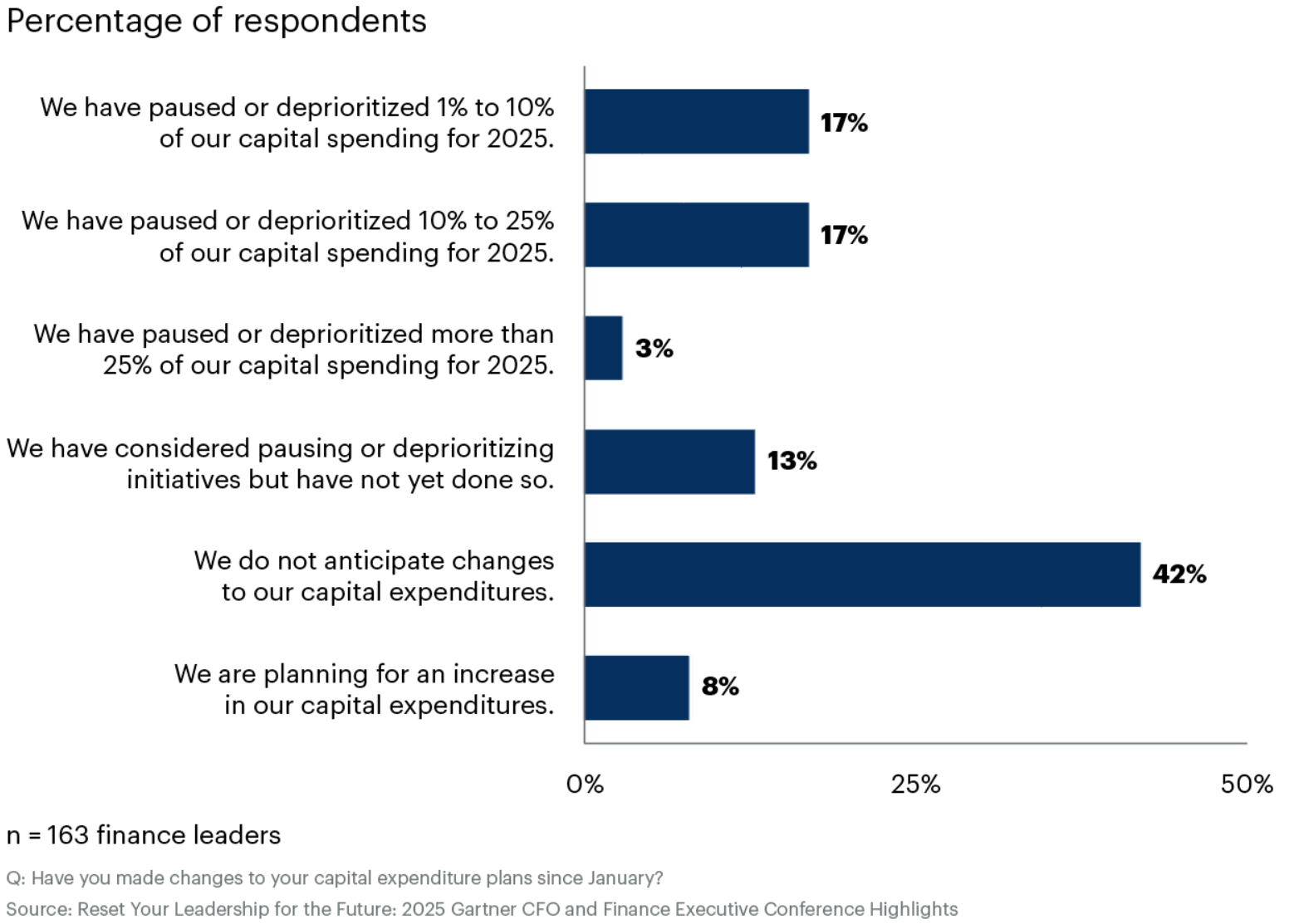 경제학에서 말하는 '옵션 가치'가 현실에서 구현되고 있다. 가트너 조사 결과를 보면, 재무 리더들의 보수적 접근이 뚜렷하게 드러난다. 응답자 중 17%는 자본지출을 1~10% 범위에서 중단했고, 또 다른 17%는 10~25% 수준에서 투자를 보류했다. 심지어 3%는 25% 이상의 대규모 자본지출을 미뤘다고 답했다.
