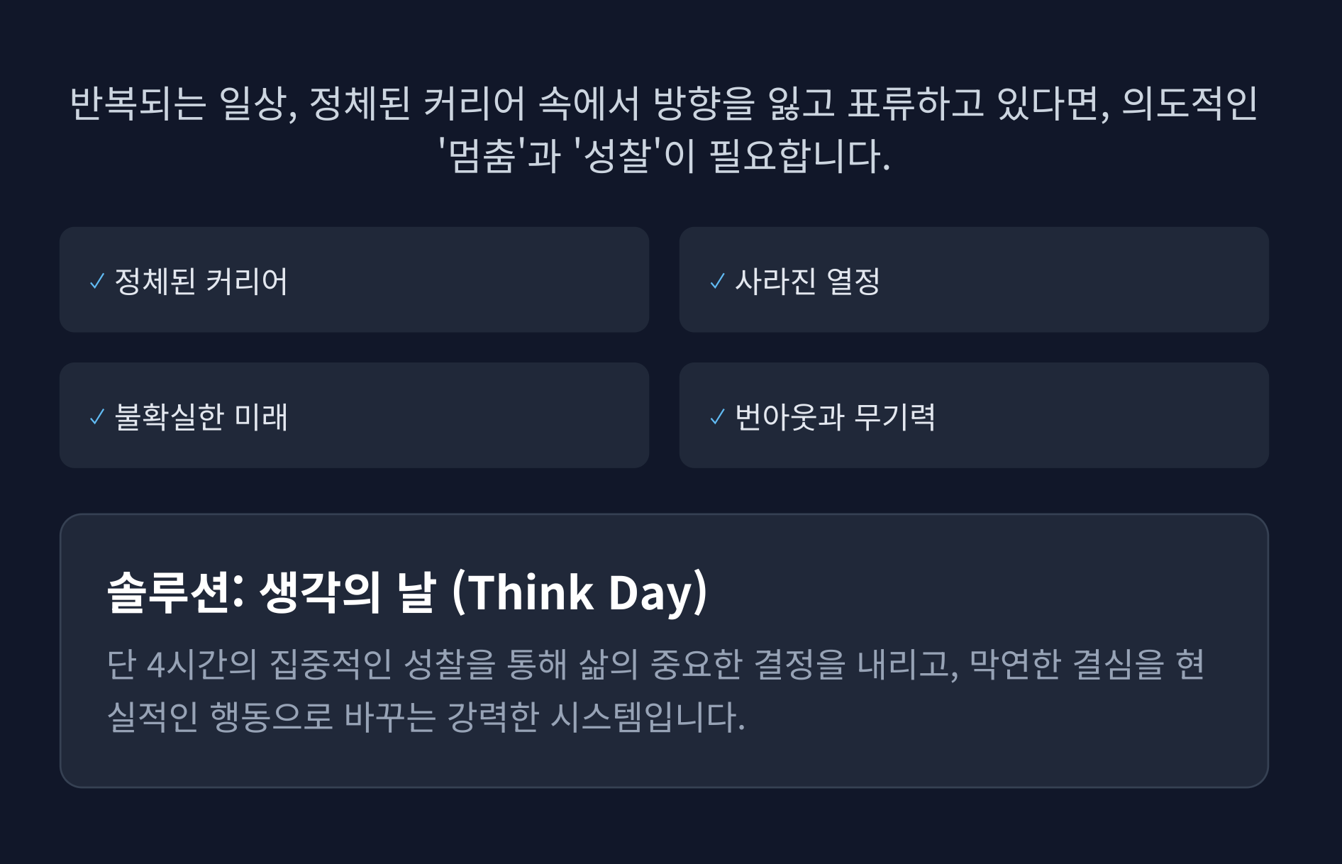 Q3. ‘생각의 날’은 경력 번아웃이나 방향 상실을 겪는 사람에게 특히 효과적인 이유는 무엇인가요?