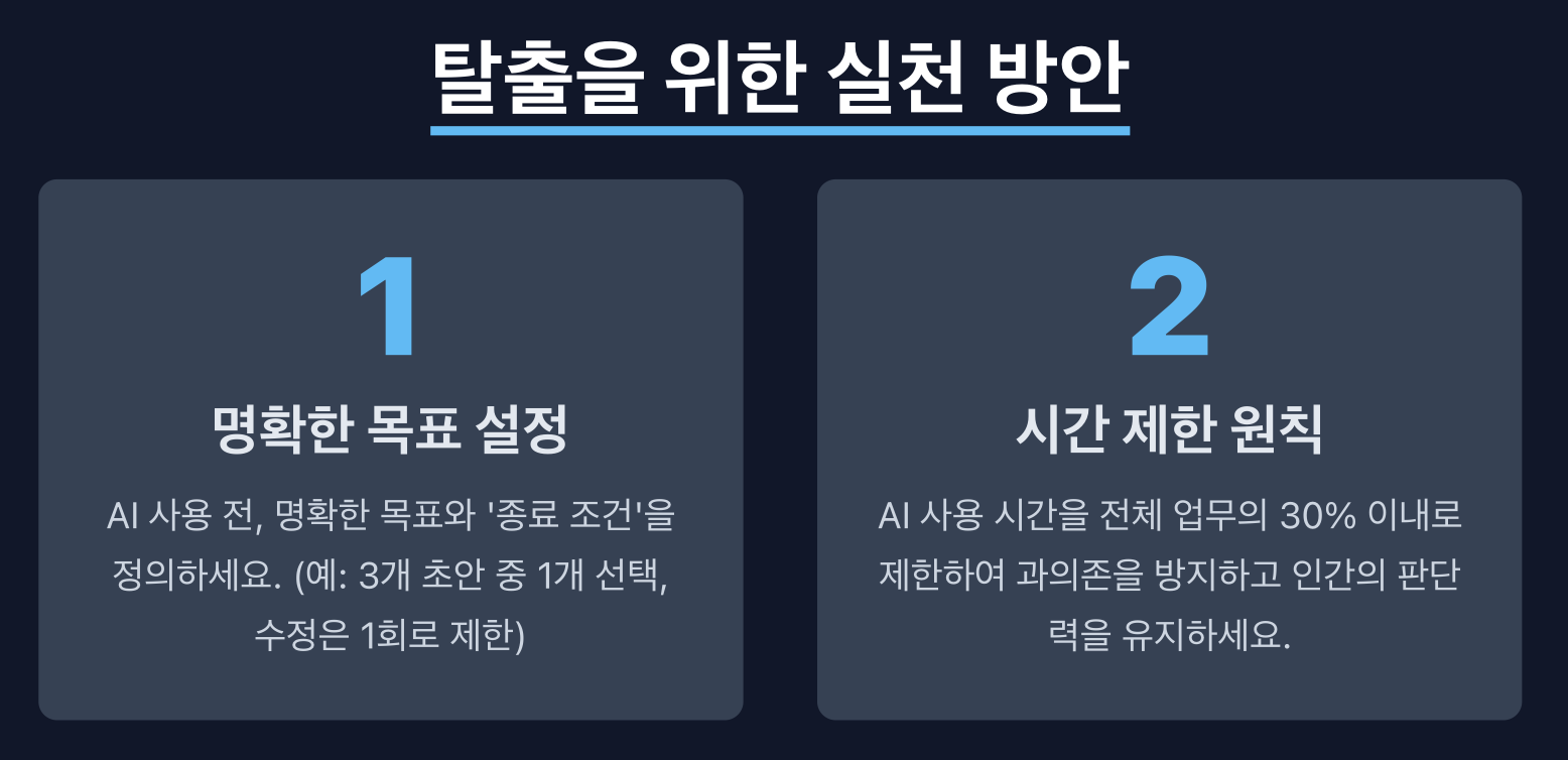 둠프롬프팅 문제 해결을 위해서는 개인과 조직 차원의 체계적 접근이 필요하다. 우선 AI 도구 사용 전에 명확한 목표와 종료 조건을 설정해야 한다. 예를 들어 프레젠테이션 자료 작성의 경우 처음 3개 결과 중 하나를 선택하고, 추가 수정은 최대 1회로 제한하는 식이다.