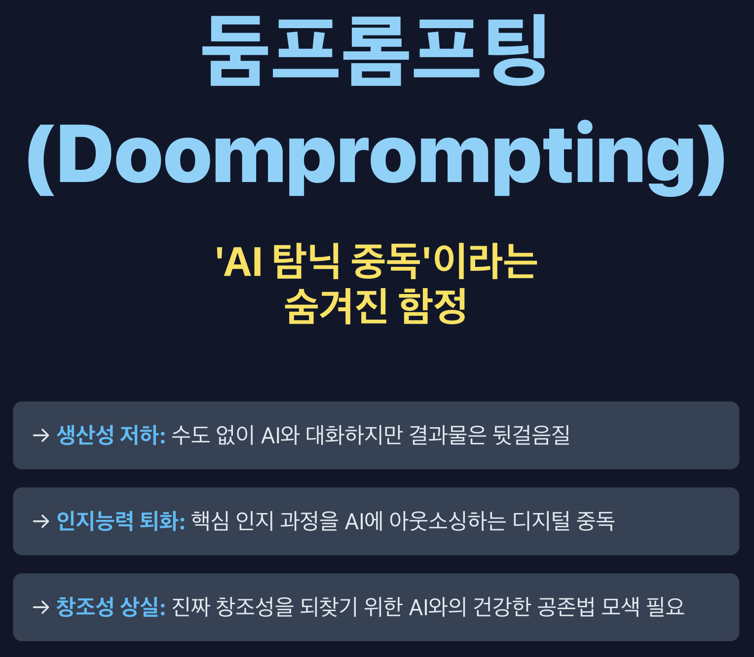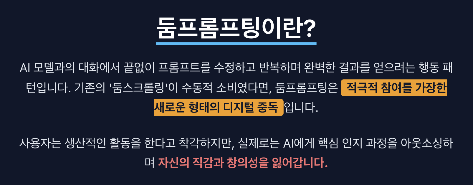 둠프롬프팅(Doomprompting)은 AI 모델과의 대화에서 끝없이 프롬프트를 수정하고 반복하며 완벽한 결과를 얻으려 하는 행동 패턴을 말한다. 기존의 둠스크롤링(Doomscrolling)이 수동적 소비였다면, 둠프롬프팅은 적극적 참여를 가장한 새로운 형태의 디지털 중독이다. 사용자는 생산적인 활동을 한다고 착각하지만, 실제로는 AI에게 핵심 인지 과정을 아웃소싱하며 창의성을 잃어가고 있다.
