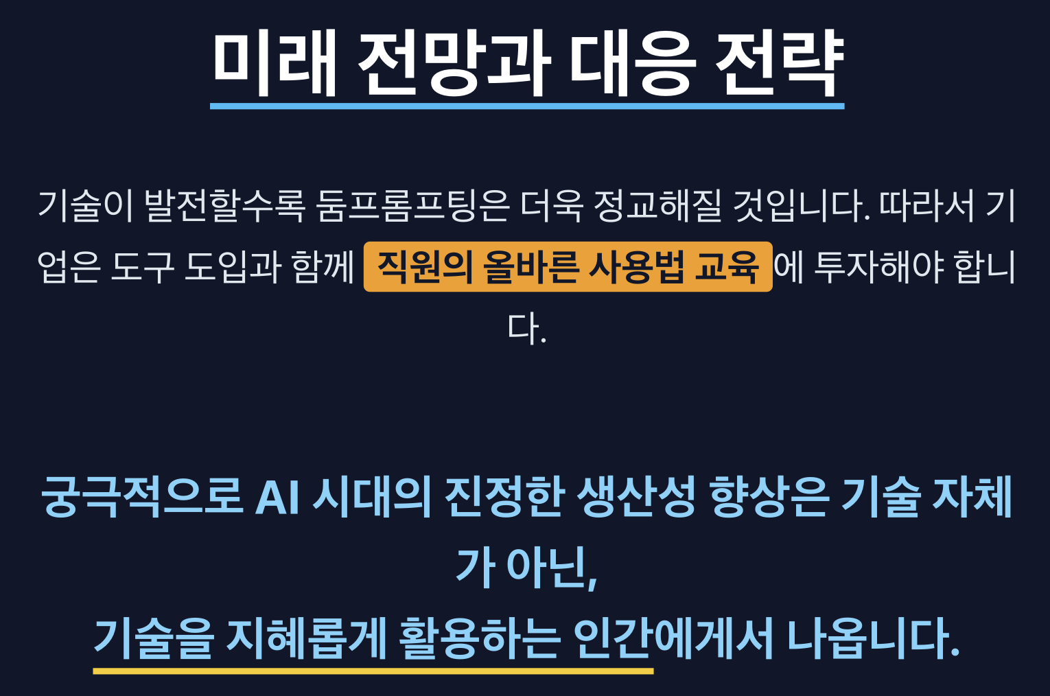 AI 기술이 계속 발전하면서 둠프롬프팅 현상은 더욱 정교해질 가능성이 높다. 따라서 기업들은 AI 도구 도입과 함께 직원들의 올바른 사용법 교육에도 투자해야 한다. 단순히 최신 AI 도구를 도입하는 것보다 효율적 활용 방법을 체득하는 것이 더 중요한 시점이 되었다.