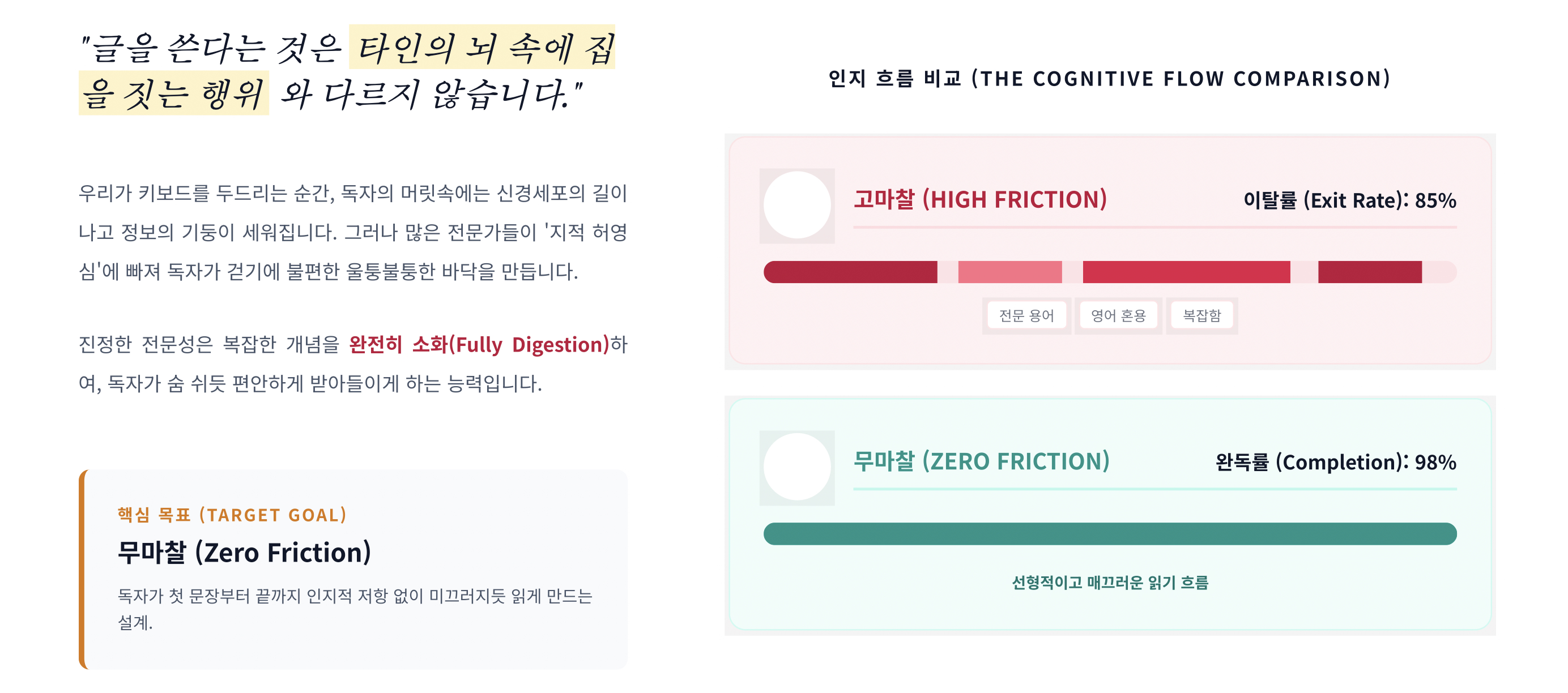 글 쓰는 사람이 2~3개의 언어를 원어민 수준으로 자유자재로 구사한다면, 그가 한글로 작성한 ‘글’은 한글만 아는 사람을 고려해서 더욱 친절하게 작성해야 한다. 읽는 사람을 배려한 편하고 친절한 글은 눈에 잘 들어와서, 글을 깊이 있게 끝까지 읽으며, 오래도록 머물며 시간을 보낼 수 있게 한다. 이를 가독성(Readability), 열독률(Read Rate), 체류율(Retention)이라고 한다.