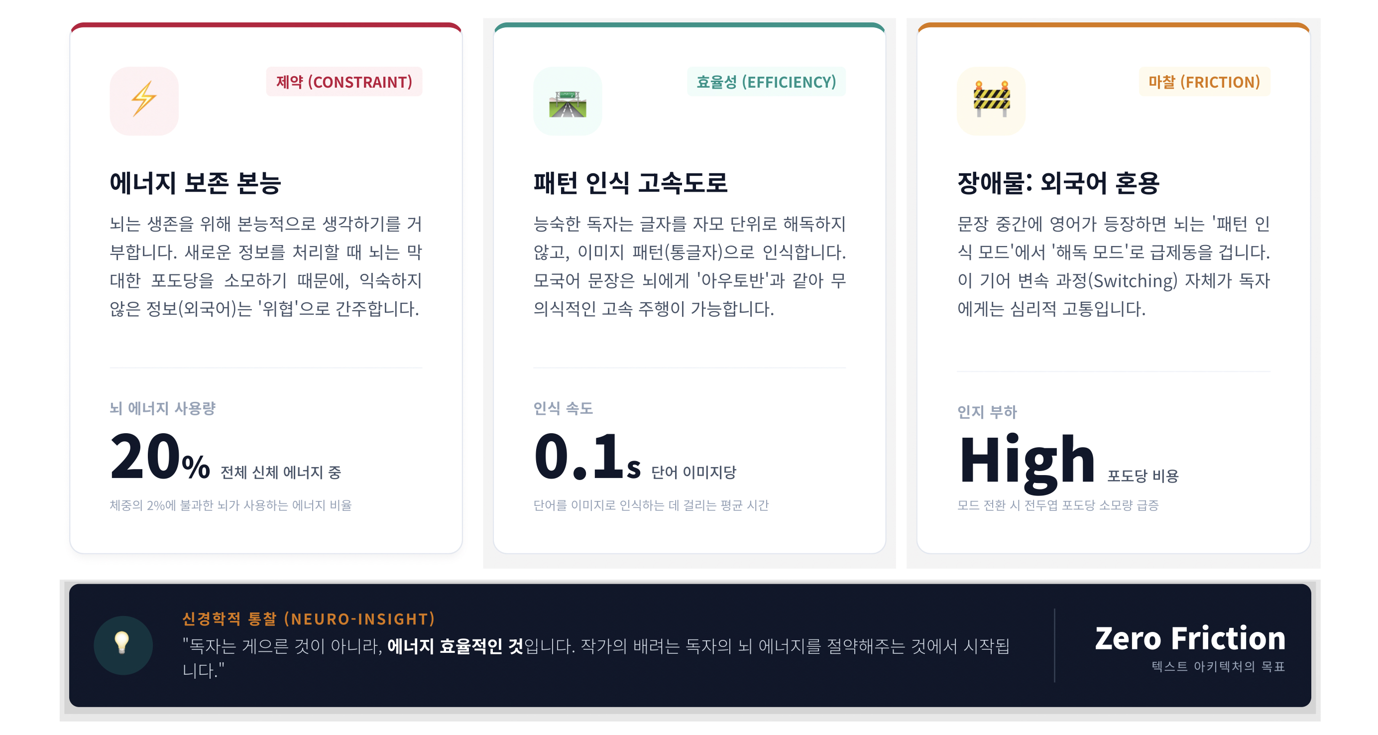 한글로 된 문장을 읽는 도중에 갑자기 외국어 단어나 문장이 나타나면 뇌는 번역 모드로 기어를 바꿔야 한다. 이때 뇌에서 소비되는 에너지를 인지적 부하라고 한다. 물론 모국어 수준으로 해당 외국어를 구사하는 사람이라면 이러한 인지적 부하의 영향이 거의 없겠지만, 해당 언어에 익숙하지 않다면 인지적 부하가 커질 수밖에 없다.