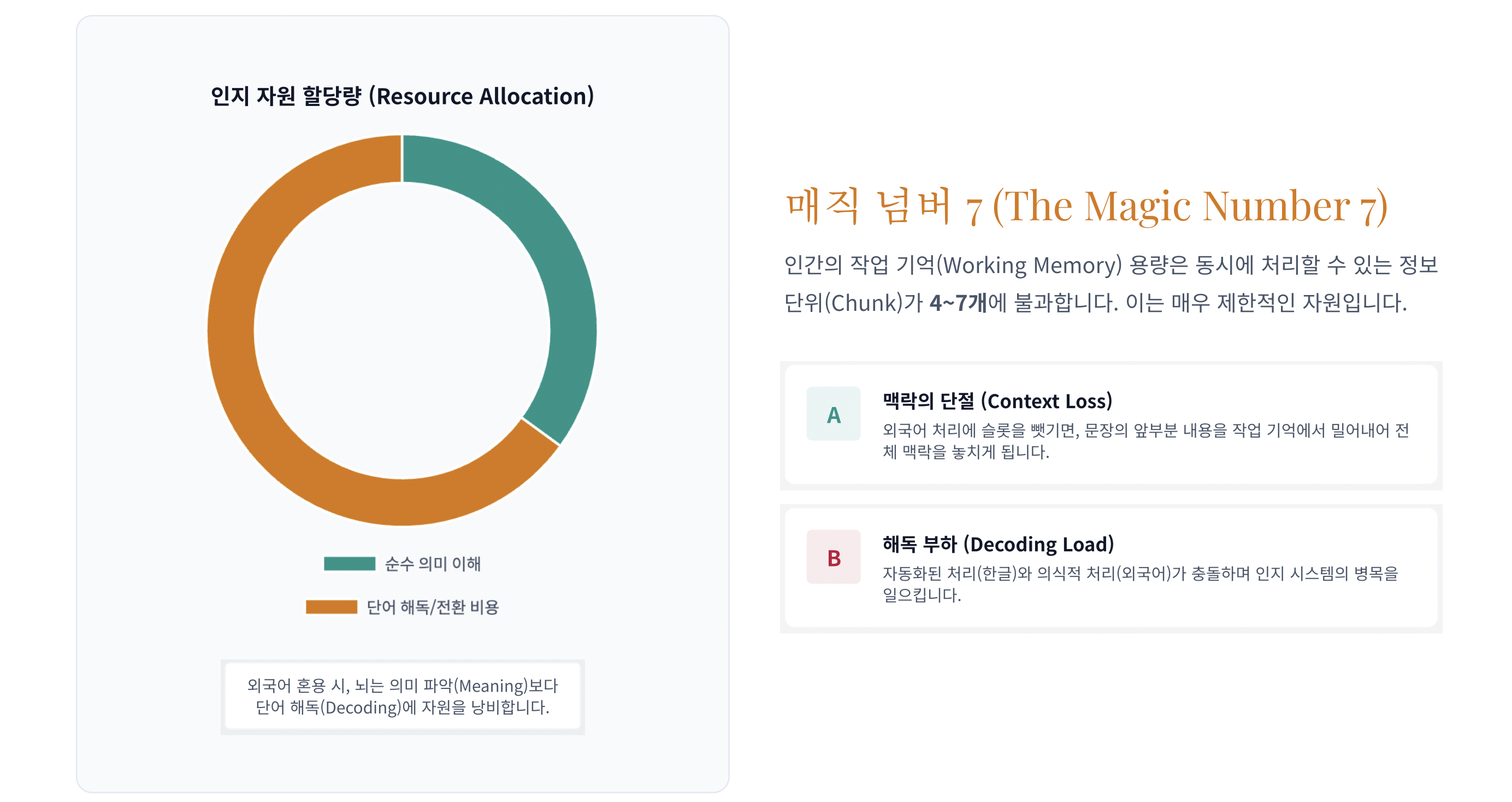 사람의 머릿속에는 작업 기억(Working Memory)이라는 공간이 존재한다. 이 공간은 마치 공부방에 놓인 작은 책상과 같아서 한 번에 올려둘 수 있는 정보의 양이 매우 적다. 인지과학 연구에 따르면 보통 사람의 작업 기억은 동시에 4개에서 7개 정도의 정보 단위만을 처리할 수 있다고 한다. 따라서 문장 속에 어려운 외국어가 반복해서 등장하면, 뇌는 그 단어의 뜻을 해석하느라 책상 위를 다 써버리는 셈이다.
