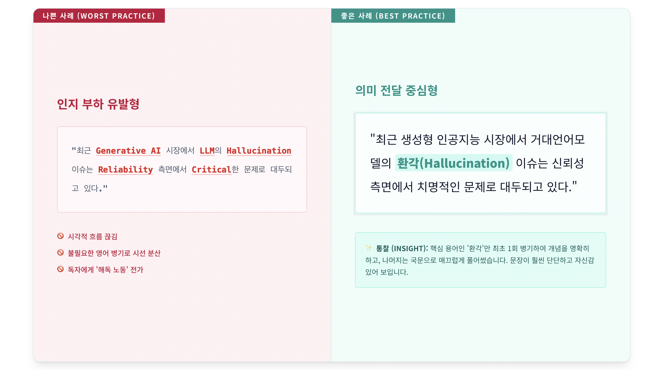 한글 작성 중에 외국어를 표기해야 할 때 가장 효과적인 방법은, 외국어가 처음 등장할 때만 '한글(외국어 원문)' 형식으로 적어주는 것이다. 예를 들어 ‘Prefrontal Cortex’라는 영어 단어가 처음 등장할 때, ‘전두엽(Prefrontal Cortex)’이라고 한글과 영어를 함께 표기하고, 이후부터는 ‘전두엽’이라고 표기하면 된다. 이러한 원칙과 규칙은 일상적인 글쓰기부터 보고서, 계약서, 보도자료 등 한글로 작성한 모든 글에 적용하는 습관을 가져야 한다.