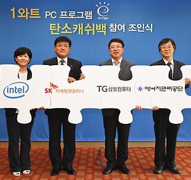 인텔코리아가 삼보컴퓨터, SK마케팅앤컴퍼니, 에너지관리공단과 함께 1와트 PC 프로그램 탄소캐쉬백 참여 조인식을 체결하고, 대기전력 절감과 온실가스 감축을 위한 1와트 PC 확산에 본격적으로 나선다. '1와트 PC'란 2010년까지 모든 가전 제품의 대기 전력을 1 와트 미만으로 낮춘다는 정부의 '스탠바이 코리아 2010' 로드맵에 따라 대기 전력 저감 기준에 맞춰 생산된 저전력 고효율 PC를 말한다. 이 기준을 충족하려면 대기 전력이 데스크톱 PC는 2.0 와트 이하, 노트북 PC는 1.0 와트 이하가 되어야 한다. 에너지관리공단에 따르면, 대기전력을 1W 이내로 줄일 경우 2010년 1,100GWh/년(1,210억 원), 2020년에는 6,800GWh/년(7,480억 원)의 전력이 절감되며, 이산화탄..