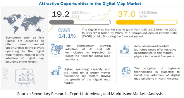 디지털 지도 시장 규모가 2021년 192억 달러에서 2026년 370억 달러로 성장하며 14.1%의 연간 성장률을 기록할 전망이다. 새로운 기술 채택에 대한 지출 증가, 시장을 주도하기 위한 고객 인텔리전스 환경의 변화, 고객 채널의 확산 등이 디지털 지도 기술과 서비스 채택이 시장 성장을 주도할 것으로 예상된다.