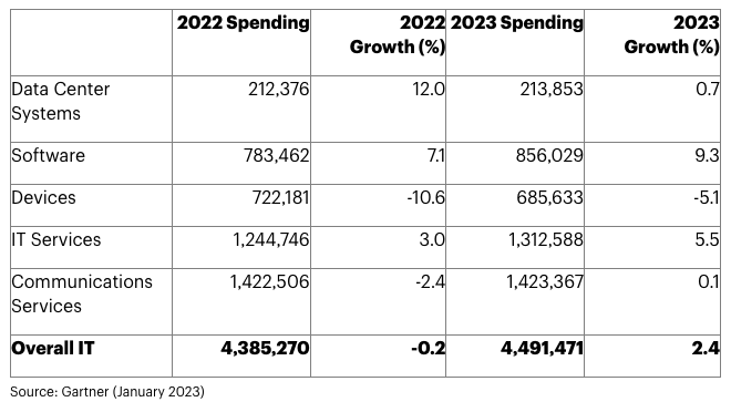 가트너는 2023년 글로벌 IT 지출 규모가 약 4조 4,000억 달러에 달하며, 2022년과 비교할 때 약 2.4% 증가할 것으로 예상했다. 이전 분기에 전망했던 5.1%의 성장 예측과 비교하면 절반 정도로 줄어들었지만, 소폭이라도 꾸준히 성장을 이어갈 것으로 보고 있는 것이다. 인플레이션으로 소비자 지출이 감소해 장치 분야에 대한 비용 지출이 줄어들더라도, 전체 기업에서의 IT 지출 규모는 여전히 증가세를 이어갈 것으로 예상했다.