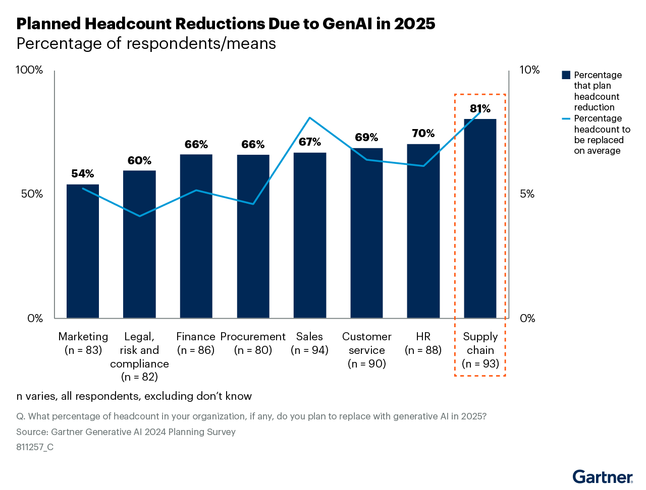 둘째, 생성형 AI는 초기 경력 직원을 위협한다는 인식이다. ‘인력 감축의 대부분이 초기 경력 직원에게 적용될 것’이라고 생각하는 공급망 리더들은 겨냥한 지적한다. 하지만 새로운 인재를 유치하고 채용하는 것에 어려움을 겪고 있는 부서에서 이러한 가정을 하는 것은 인재 파이프라인을 채우고 유지하는 것을 더욱 어렵게 만들 뿐이다.