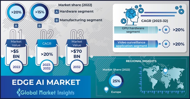 GMI(Global Market Insight)가 '2023년부터 2042년까지 에지 AI 시장 전망(Edge AI Market Forecast, 2023-2032)' 보고서를 발표했다. 보고서는 에지 AI 시장을 구성 요소(하드웨어, 소프트웨어, 서비스), 사용 분야(제조, 헬스케어, BFSI, 정부, 소매 및 전자상거래, 통신, 운송 및 물류), 애플리케이션(비디오 보안, 원격 모니터링, 예측 유지 보수), 지역 등으로 구분해 분석을 진행했다.