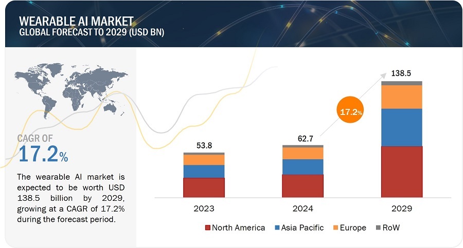 웨어러블 AI 시장이 2029년까지 17.2%(CAGR) 성장할 전망이다. 2024년 627억 달러였던 시장 규모는 2029년 1,385억 달러에 달할 것으로 예상된다. 건강 및 피트니스에 대한 관심 증가, 웨어러블 기술 발전, 스마트폰 및 사물인터넷의 통합 등이 시장 성장을 이끄는 요인으로 지목됐다.