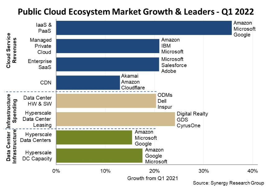 시너지 리서치 그룹(Synergy Research Group) '2022년 1분기 퍼블릭 클라우드 생태계 성장과 리더(Public Cloud Ecosystem Market Growth & Leaders - Q1 2022)'를 발표했다. 서비스 및 인프라 시장으로 구성된 퍼블릭 클라우드 생태계를 이끌고 있는 기업은 대부분 미국이 차지했으며, 그 뒤를 중국이 뒤따르고 있다.