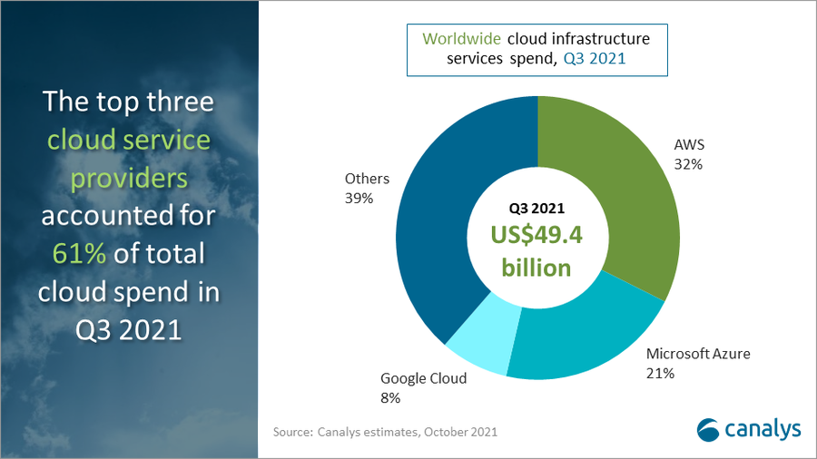 2021년 3분기 글로벌 클라우드 서비스 지출 규모가 지난해 같은 기간에 비해 35% 증가한 것으로 조사됐다. 2020년 3분기 365억 달려였던 클라우드 서비스 지출은, 올해 3분기 129억 달러가 증가하면서 494억 달러를 기록했다. 2021년 2분기와 비교하면 지출 규모가 약 24억 달러 증가했다. 코로나19(COVID-19) 펜데믹으로 급증한 클라우드 서비스 수요가 여전히 시장을 견인하고 있는 상황이다.