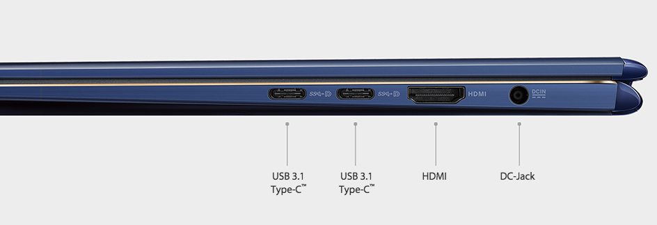 외부 입출력 단자는 2개의 USB-C(USB 3.1 Gen 1) 3.0과 1개의 USB 2.0, 1개의 HDMI와 콤보 오디오 잭을 지원한다. 디스플레이 위쪽에는 얼굴 인식용 적외선 카메라와 영상 통화용 웹캠을 탑재했다.(사진:www.asus.com)