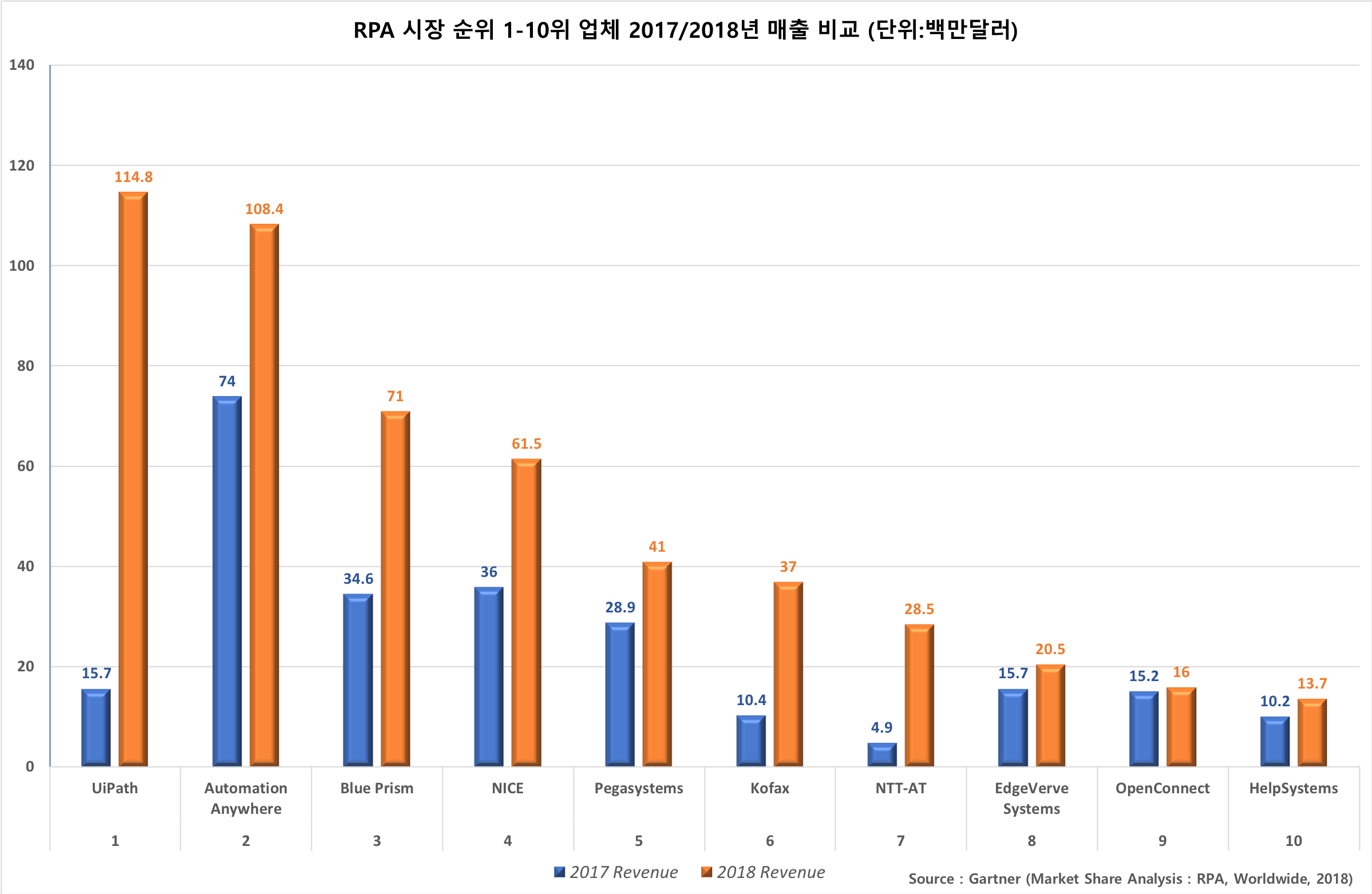 가트너가 ‘2018년 글로벌 RPA 시장 점유율 분석(Market Share Analysis : Robotic Process Automation, Worldwide, 2018)’ 보고서를 발표하고, 이를 요약한 보도자료를 통해 2018년 RPA 시장이 2017년과 비교할 때 63.1% 성장했다고 밝혔다. 전 세계 RPA 시장 매출액은 2017년 약 5억 1,800만 달러에서, 2018년 약 8억 4,600만 달러로 큰 폭으로 증가했다. 2019년 매출 규모는 약 13억 달러가 될 것으로 가트너는 예측했다.