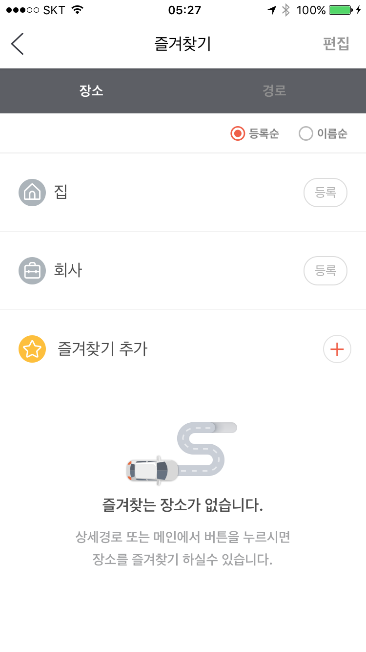 즐겨찾기 메뉴 화면으로 가면 집, 회사 항목이 있고, 아래쪽에 ‘즐겨찾기 추가’ 항목을 볼 수 있다. 집과 회사는 옆에 있는 ‘등록’ 버튼을 터치한 후, 주소나 이름으로 검색해서 등록하면 된다. 자주 가는 곳은 즐겨찾기 추가 항목 옆의 ‘등록’ 버튼을 터치해서 같은 방법으로 저장할 수 있다.