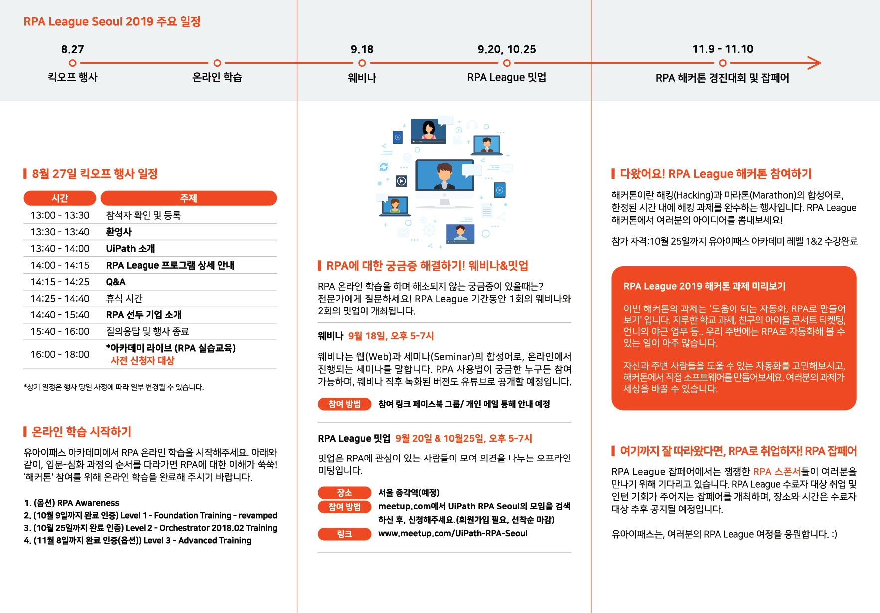 RPA 리그 서울은 8월 27일 킥오프를 시작으로 11월 11일까지 진행된다. 리그 기간 동안 온라인 교육, 웨비나, 밋업, 해커톤, 잡페어 등이 진행될 예정이다.