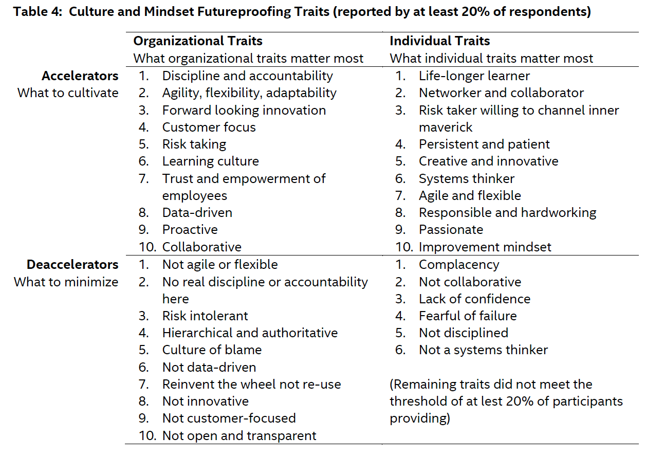 미래 지향적인 문화와 사고방식(mindset)을 기르기 위해서, 조직과 개인이 향상하거나 버려야 할 특성(trait)에 대해, 조사 대상자들이 중요하게 생각하는 것들도 공개했다. 각 항목은 모두 10가지로 구성되어 있으며, 전체 응답자 중에서 최소한 20% 이상이 답변한 것들에 대해 순위를 매겼다. 다만, 개인 특성에서 버려야 할 항목만 20%의 응답률을 넘지 못해 10개를 채우지 못했다.