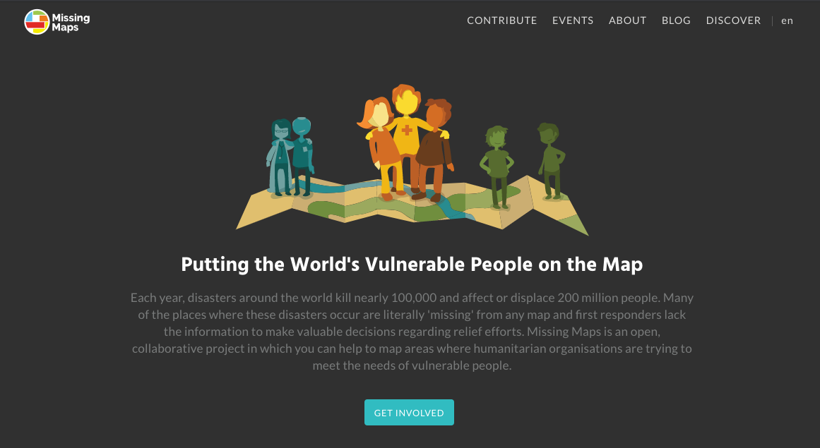 미국 적십자사가 진행하는 미씽 맵 프로젝트 홈페이지. 누구나 자원봉사자로 미씽 맵 프로젝트에 참여해, 개발도상국의 취약 지역을 촬영한 위성 사진에서 지도에 표시되지 않는 다리나 도로 등의 시설을 찾을 수 있다.(화면:MissingMap)