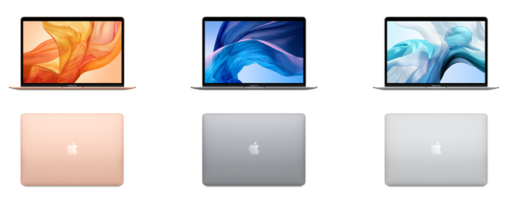 색상은 골드, 스페이스 그레이, 실버 세 가지 중에서 선택할 수 있다. 본체는 100% 재활용 알루미늄을 사용했고, USB-C 타입 썬더볼트 3 단자 2개와 헤드폰 단자를 내장했다. 충전과 외부 주변기기 및 외장 모니터 연결은 USB-C 단자를 이용한다. (사진:apple.com)
