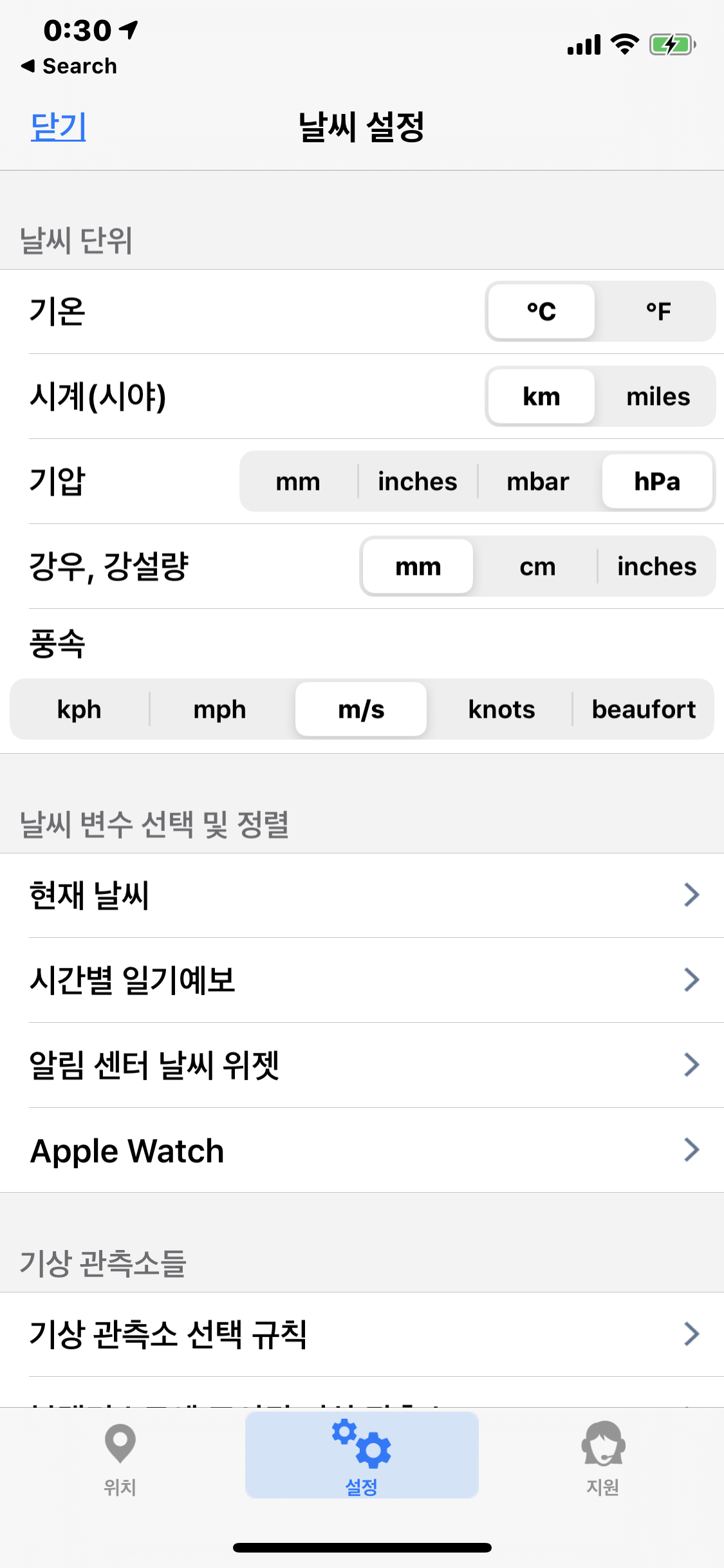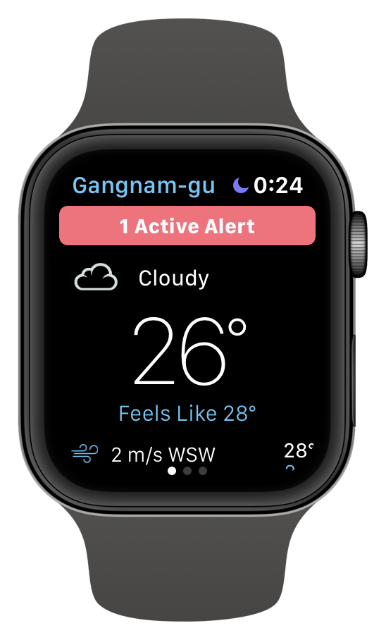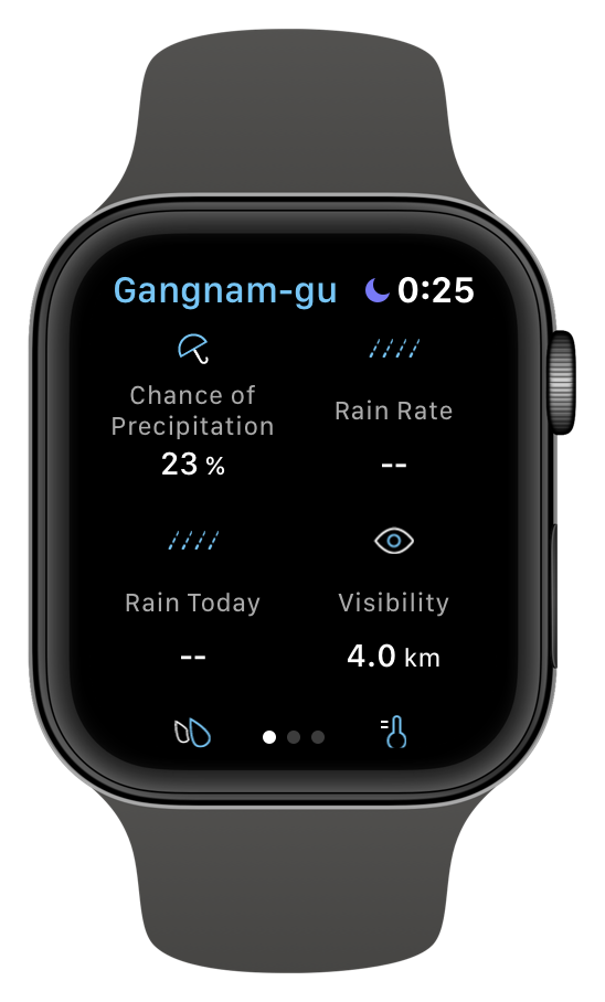 애플 워치와 연동해 필요한 기상 정보를 확인할 수 있다. 현재 기상 상황, 일기 예보를 시간 및 하루 단위로 워치해서 확인할 수 있다.