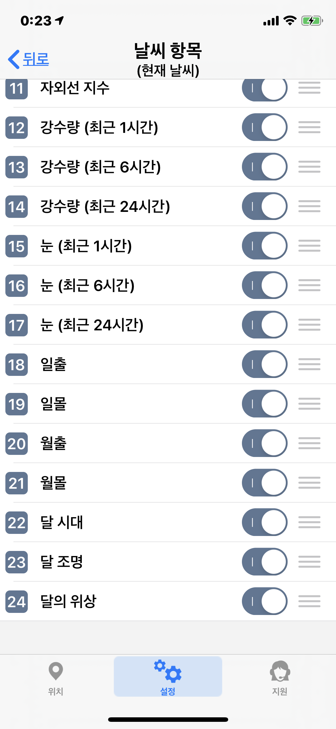 현재 날씨에서 선택할 수 있는 항목은 다음과 같다. 비 올 확률, 강우율, 오늘 강우량, 시계, 습도, 기압, 구름양, 체감온도(풍속지수), 체감온도(열지수), 이슬점, 자외선 지수, 강수량(최근 1시간), 강수량(최근 6시간), 강수량(최근 24시간), 눈(최근 1시간), 눈(최근 6시간), 눈(최근 24시간), 일출, 일몰, 월출, 월몰, 달의 위상 등이다.